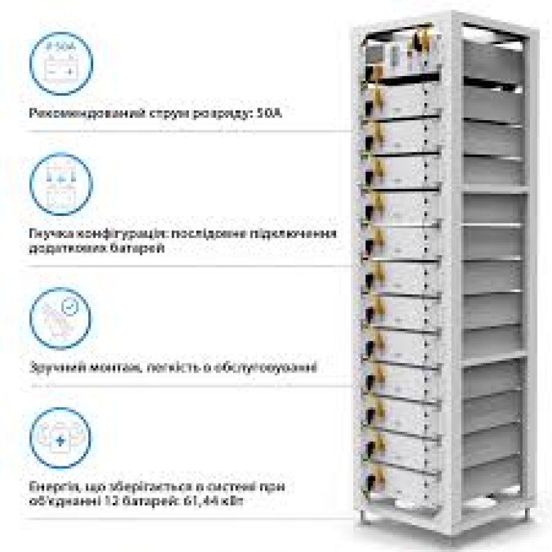 Цей акумулятор легко інтегрується у високовольтні системи та чудово працює з інверторами Deye. Його потужність у 5.12 кВт·год дозволяє покривати високі енергетичні навантаження без втрати ефективності. Завдяки інтелектуальній системі керування BMS, акумулятор самостійно стежить за станом осередків, захищаючи від перенапруги, перегріву та короткого замикання.